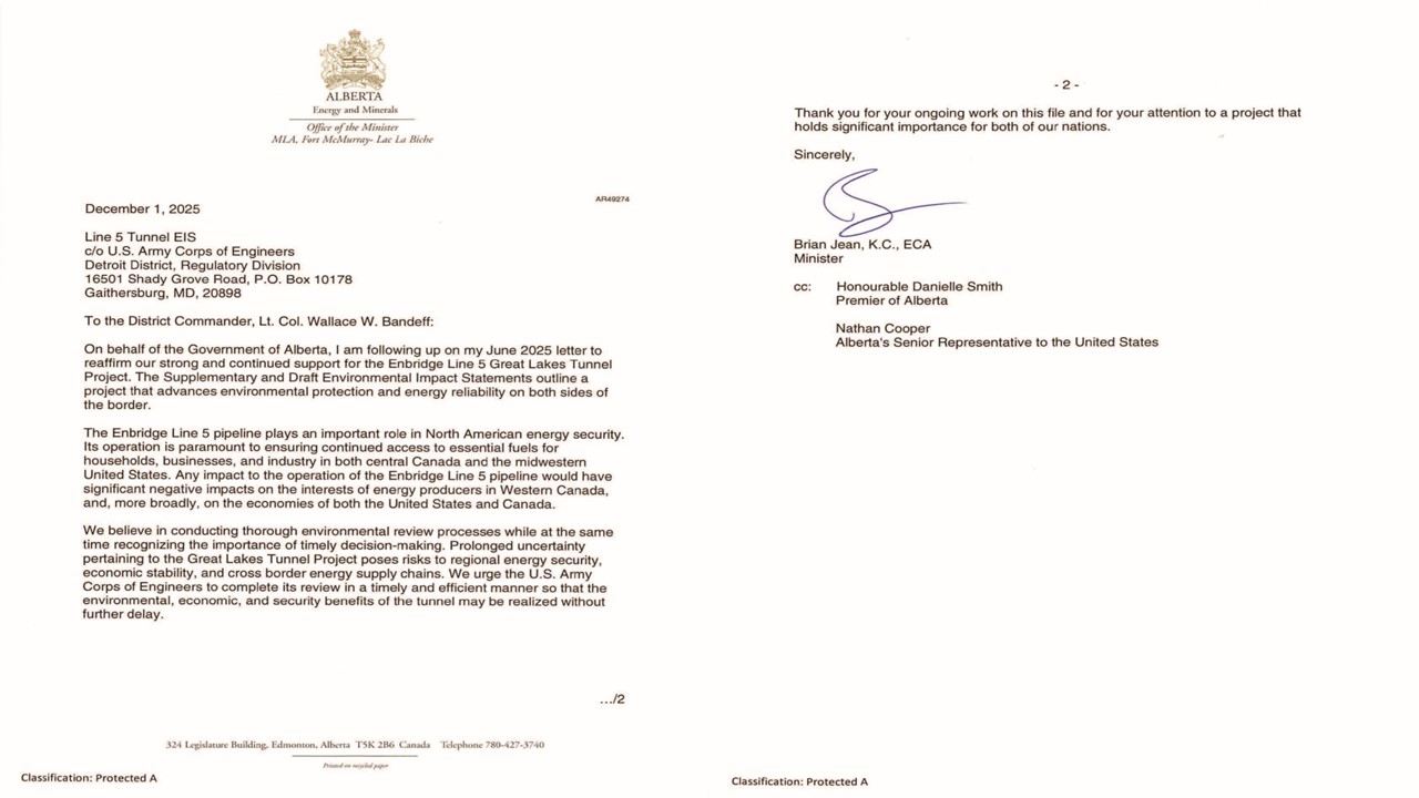 Government of Alberta letter of support for Enbridge Line 5 Great Lakes Tunnel Project.